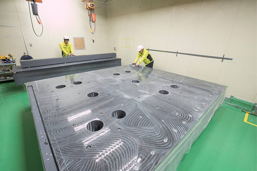 高い精密位置決めを必要とするFPD業界を中心に製造装置のベースや定盤、治具等を製造しており、近年ではグラナイトマシンベースに、各種ベアリング、モータ、エンコーダー、ガイドを組み合わせた、高精度装置の開発や設計、製造を行っています。