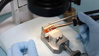 PIセラミックでは、お客様の製品へのピエゾセラミック部品の組み込みを行っています。お客様の要件に応じての素子の電気接続加工およびお客様が用意された部品の取り付けや、ピエゾセラミック部品の接着、鋳造などに対応しています。PICMA®多層アクチュエータは、お客様独自のガイドメカニズムや機械てこなどに一体化することが可能です。