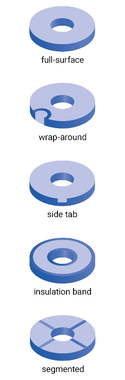 | 電極設計 | さまざまな設計からお選びいただけます:全面、ラップアラウンド、サイドタブ、絶縁バンド、分割(右の列を参照) |