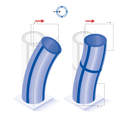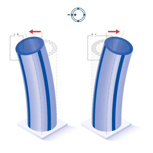 たとえば、内側が正の分極方向、外側が負の分極方向を持つチューブの場合、変位方向は次のようになります。