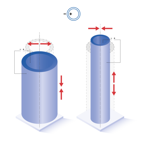 ピエゾチューブをアクチュエーターとして使用する場合、電圧を印加すると機械的な変位が生じます。 この変位は、DC電圧を印加した場合は静的変形として、AC電圧を印加した場合は超音波範囲などの振動運動として生じます。 ピエゾ部品の設計に応じて、動作は軸方向と横方向のどちらでも発生させることが可能です。 変位の振幅は、ピエゾチューブの寸法と印加電圧の大きさの両方から影響を受けます。