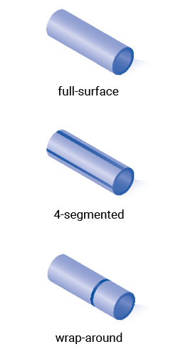 | 電極設計 | 多分割チューブに加え、全面、4分割、ラップアラウンドなどの設計も可能です。 右の列をご覧ください。 |