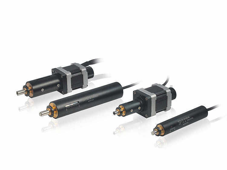 High-resolution linear actuator with stepper motor; 2-phase stepper motor with gearhead; 25 mm travel range; 50 N feed force; 1.5 mm/s maximum velocity; trapezoidal-threaded spindle; limit switches: Hall effect; 0.5 m cable length
