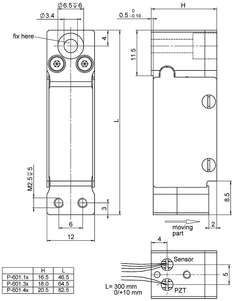 PiezoMove linear actuator with guides; PICMA® piezo actuator drive; 250 µm travel range; SGS, indirect position measuring; connecting wires; 0.3 m cable length