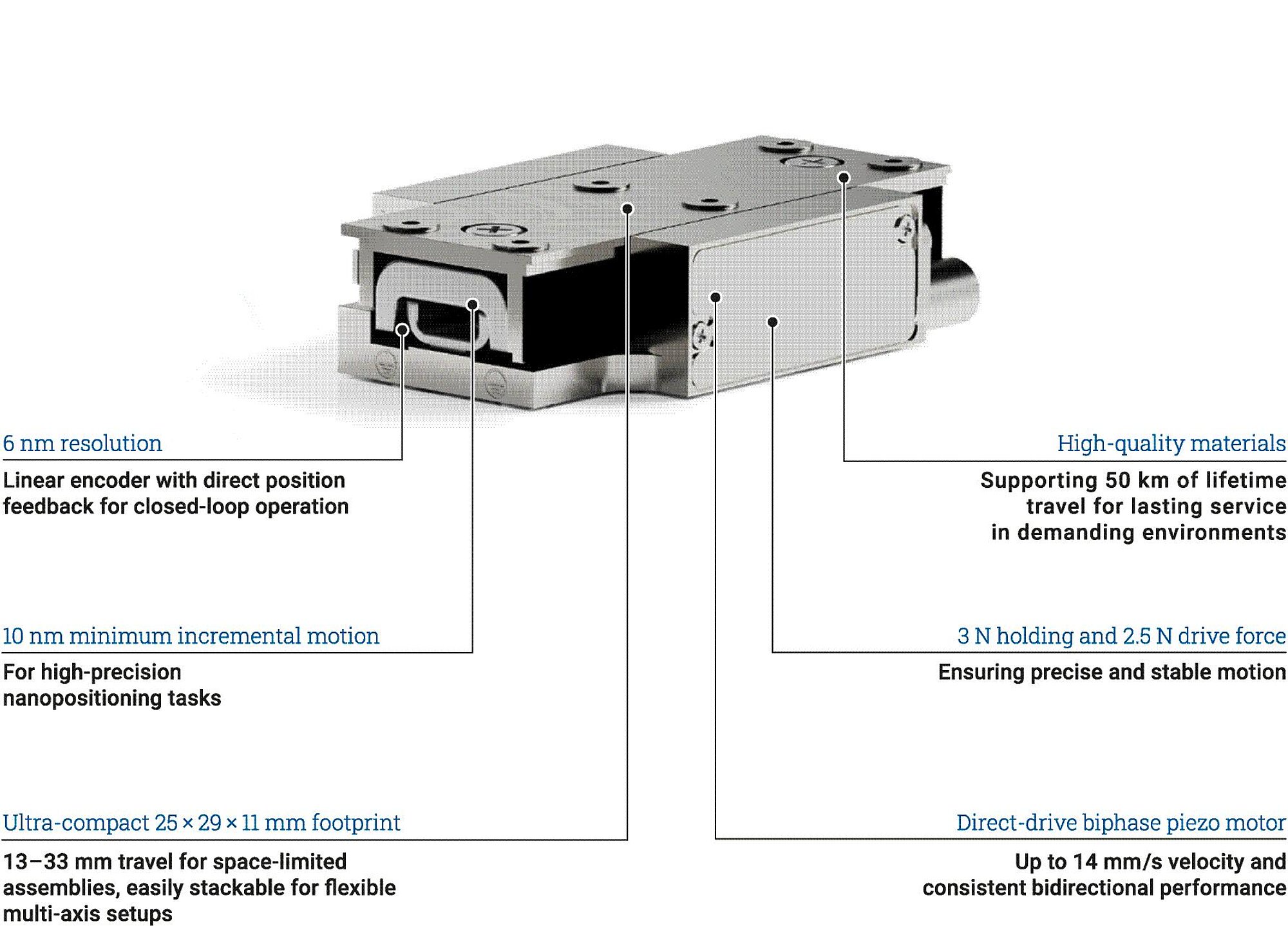 BIX miniature linear stage, piezoelectric inertia drive, 13 mm travel range, linear encoder, 6 nm resolution, 2.5 N drive force, ​d​i​m​e​n​s​i​o​n​s 25 × 29 × 11 mm (L × W × H)
