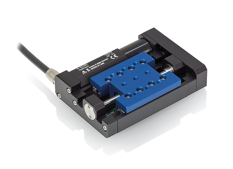 Microtranslation stage; DC motor; 25 mm travel range; 50 N load capacity; 20 mm/s maximum velocity; ball screw; incremental linear encoder, 100 nm sensor resolution, A/B quadrature, RS-422; 0.5 m cable length