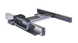 Stackable, highly compact, universal linear stage; 2-phase stepper motor; 200 mm travel range; 150 N load capacity; 80 mm/s maximum velocity; ball screw; electromagnetic safety brake; folded drivetrain
