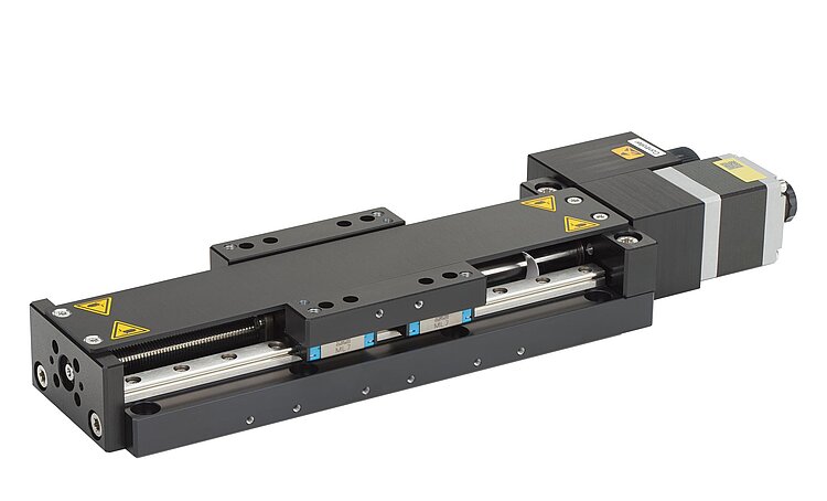 Stackable, highly compact, universal linear stage; 2-phase stepper motor; 100 mm travel range; 150 N load capacity; 80 mm/s maximum velocity; ball screw; electromagnetic safety brake