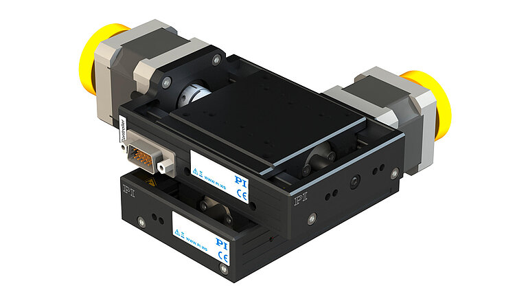 XY combinations of VT-80 linear stages are possible without an adapter. The compact XY variant with 25 mm travel range per axis is available for both motor types as factory option (preassembled at the factory):