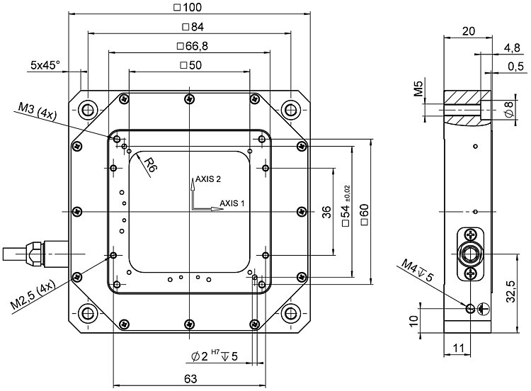 XY piezo nanopositioner; 100 µm × 100 µm travel range (X × Y); capacitive, indirect position measuring; D-sub 25W3 (m); 1.5 m cable length