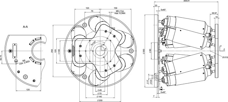 The maximum travel ranges of the individual coordinates (X, Y, Z, θX, θY, θZ) are interdependent. The data for each axis shows its maximum travel range when all other axes are in the zero position of the nominal travel range and the default coordinate system is in use, or rather when the pivot point is set to 0,0,0.