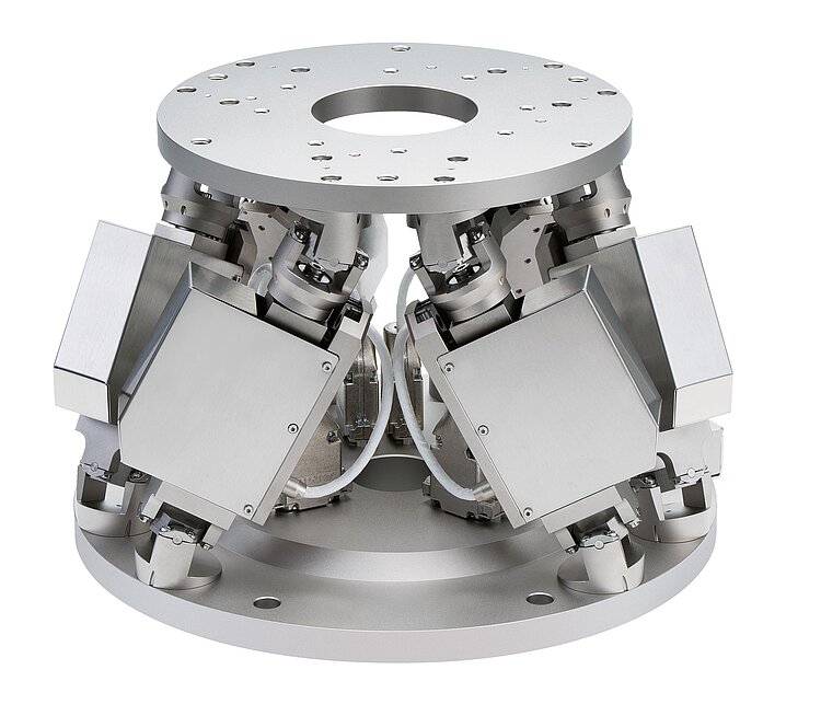 6自由度のパラレルキネマティック設計により、シリアルキネマティックシステムに比べてはるかに小さく、剛性とダイナミクスが向上。可動ケーブルがないため、高い信頼性と低摩擦を実現できます。 折りたたみデザインの駆動部によりコンパクト。 10-6 hPaまでの真空環境に適しています。
