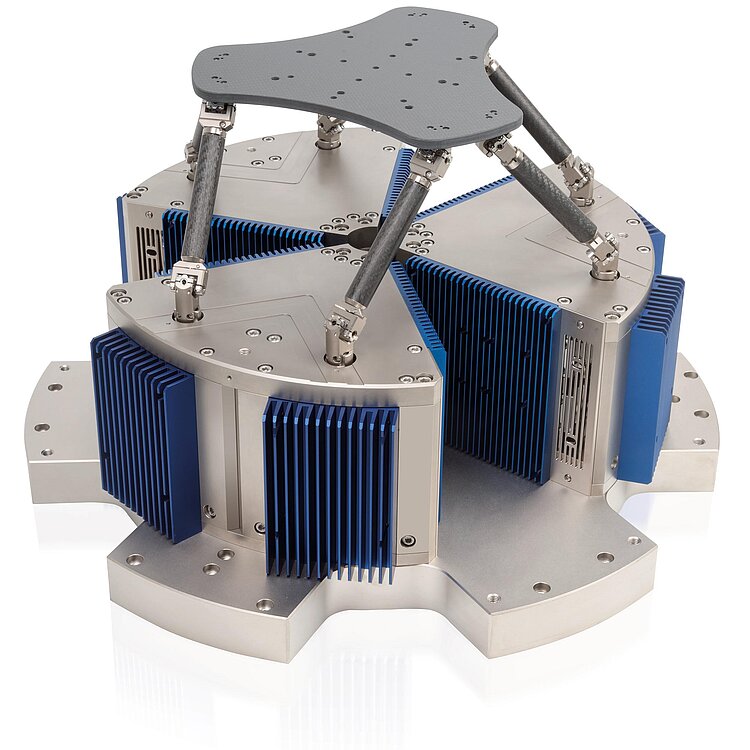 6自由度のパラレルキネマティック設計により、シリアルキネマティックシステムに比べてはるかに小さく、高い剛性を実現します。可動ケーブルはありません。 正弦曲線や自由定義の軌道などの事前定義済みのモーションプロファイルに従い、優れた移動精度で精密な動作を実行します。