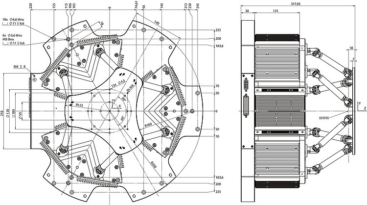 このシミュレーションソフトウェアは、ヘキサポッドの作業スペースと耐荷重の限界値をシミュレートします。 これにより、購入前であっても、特定のヘキサポッドモデルが、用途で発生する荷重、力、トルクに耐えられるかどうかを確認できます。 この目的のために、シミュレーションツールは、ヘキサポッドの位置と動作、回転中心、複数の参照座標系を考慮します。