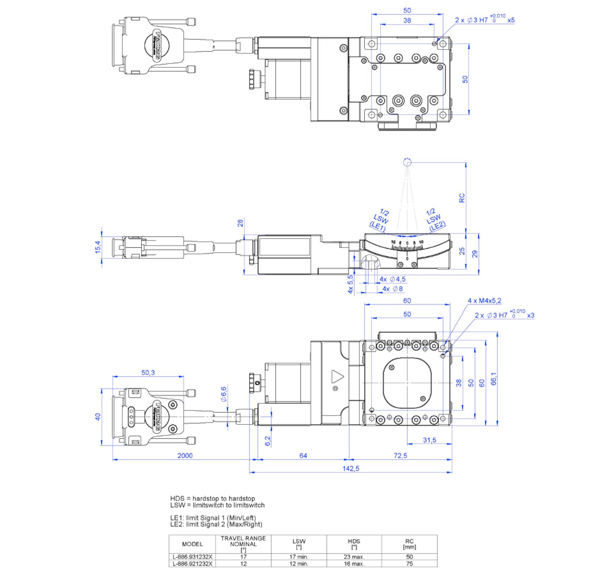 The goniometers can be mounted onto L-836 linear stages. The L-886 models are stackable for 2-axis motion. If an L-886.931232X is mounted onto an L-886.921232[X], the models will have a common center of rotation.