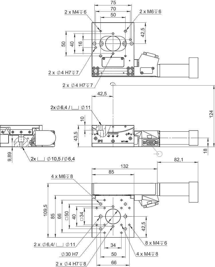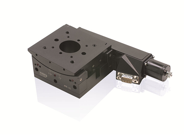 Drive with high gear ratio for precision positioning. Two limit switches. Large clear aperture with 30 mm diameter. Can be combined with WT-100 for 2-axis motion with shared pivot point.