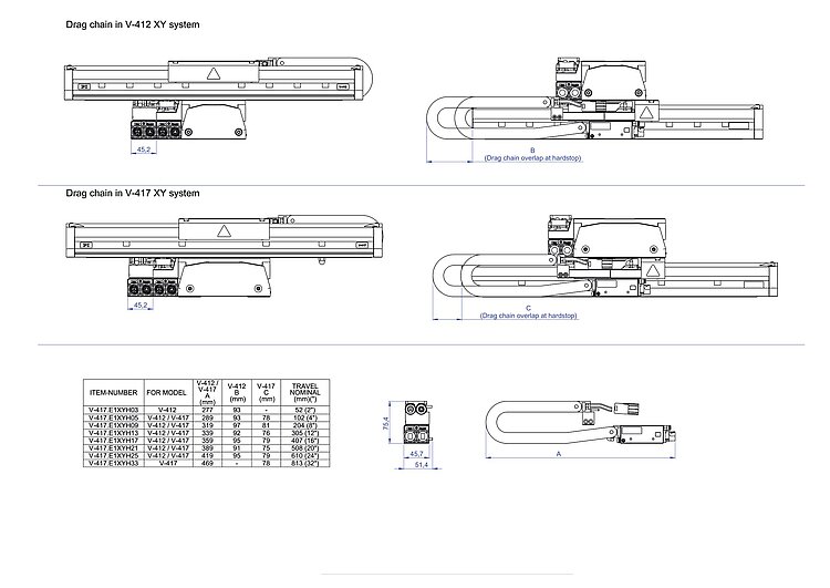 Regardless of the travel range of the Y axis, the V-417.E1XYHxx drag chain must be selected for the travel range of the X axis.