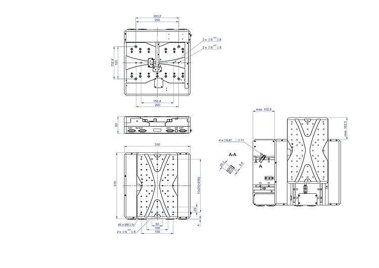Precision XY stage; DC motor; 205 mm × 205 mm travel range (X × Y); 200 N load capacity; 50 mm/s × 50 mm/s maximum velocity; ball screw; incremental linear encoder, 20 µm sensor signal period, sin/cos, 1 V peak-peak